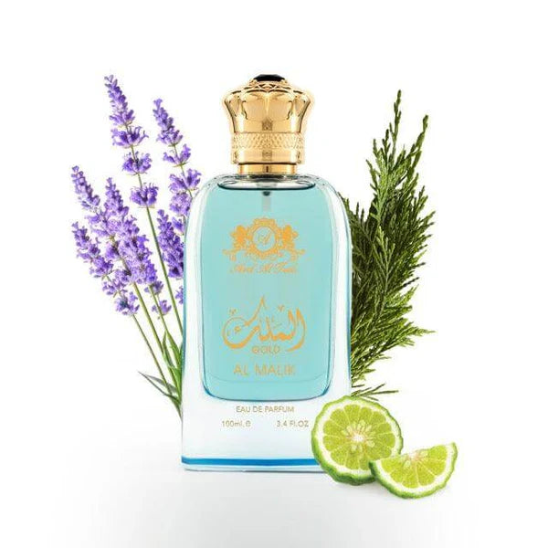 Al Malik Gold Eau de Parfum: A regal blend of Bergamot, Cypress, and Lavender crowned with heart notes of Geranium and Juniper Berries. With its Fougère Aquatic essence, Al Malik Gold embodies strength and sophistication, a fragrance fit for royalty. Experience the majestic allure of Al Malik Gold