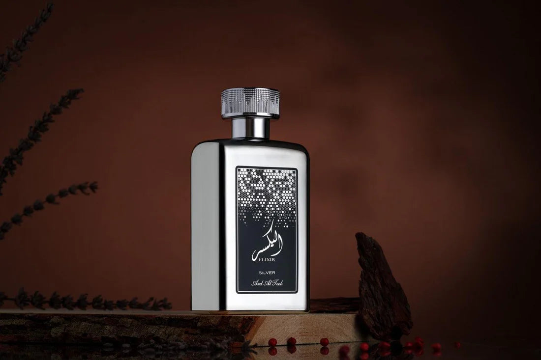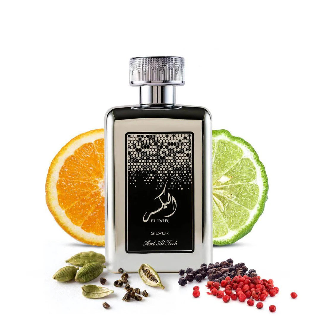 Explore the essence of sophistication with Elixir Silver Eau de Parfum. Woody aromatic tones blend Cardamom, Black Pepper, Bergamot, Pink Pepper, and Orange Oil. Secondary hints of Coffee, Lavender, Cinnamon, Geranium, Star Anise, Caramel, and Orange Blossom weave a captivating narrative in this latest range.