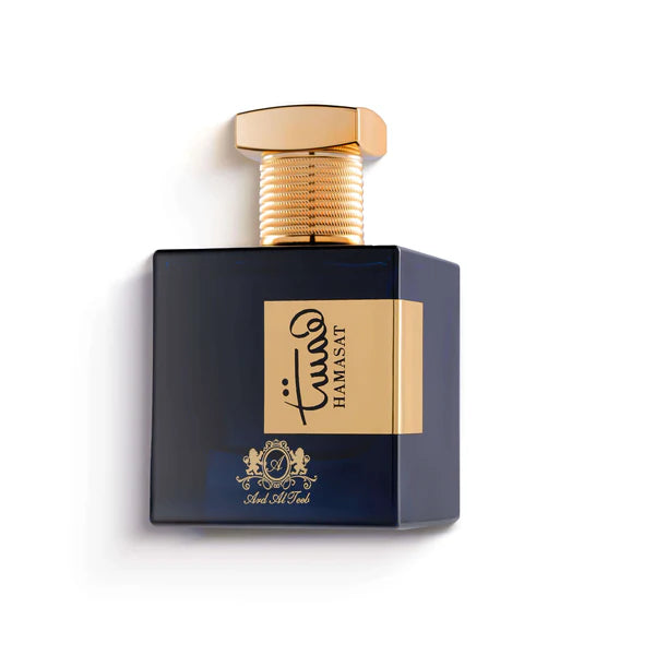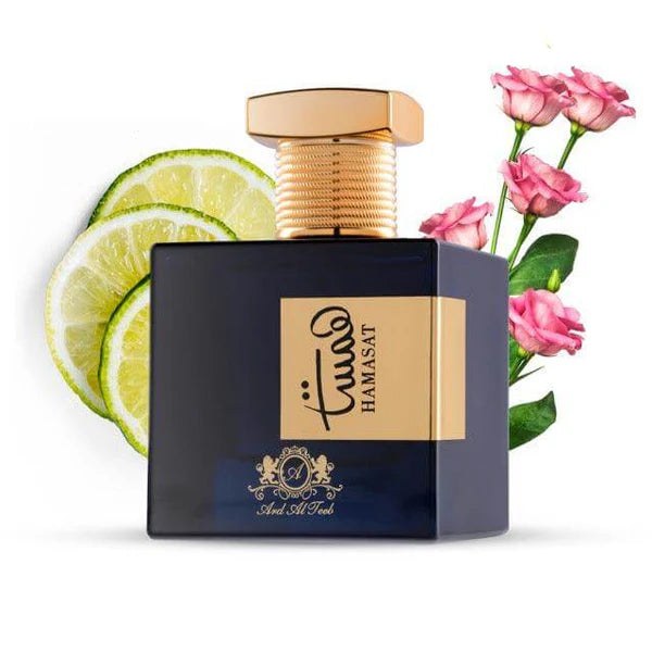 Hamasat Eau de Parfum blends Almond, Coffee, and Lemon in its top notes. Jasmine and Rose infuse the heart with floral richness. Tonka Bean, Cacao, and Sandalwood form a warm, comforting base, creating a delightful Floral Fruity fragrance that captivates the senses with its vibrant and inviting aroma.